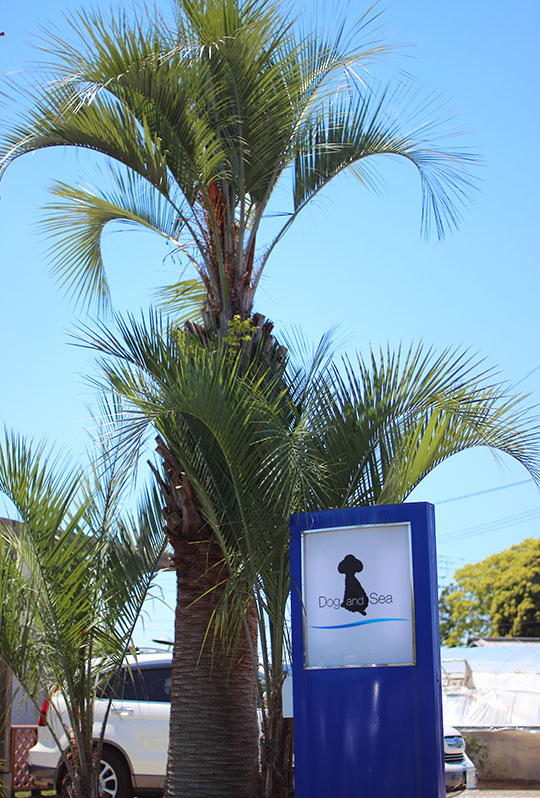 スカイブルーの屋根、大きなココス椰子を目印にお越し下さい。建物の前が駐車場です。